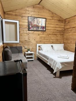 В комнате : собственный санузел , двуспальная кровать , отопление в зимний период , холодильник , телевизор