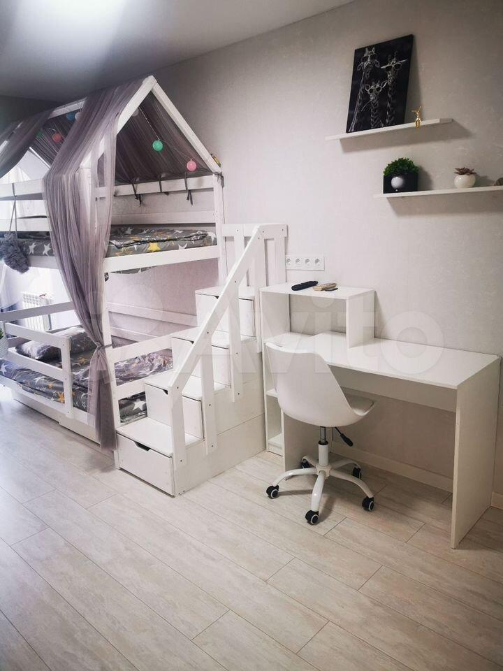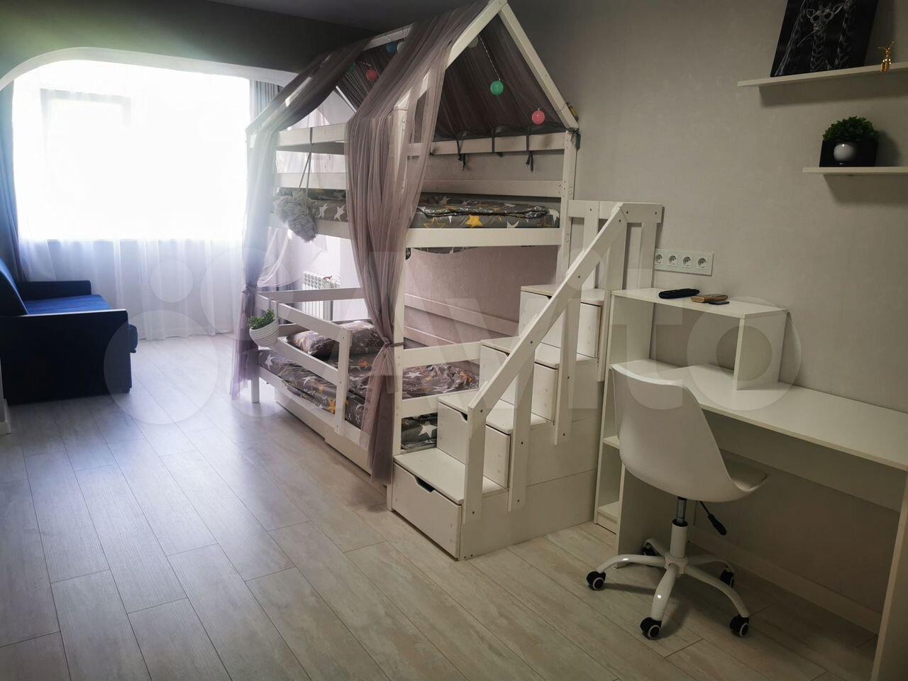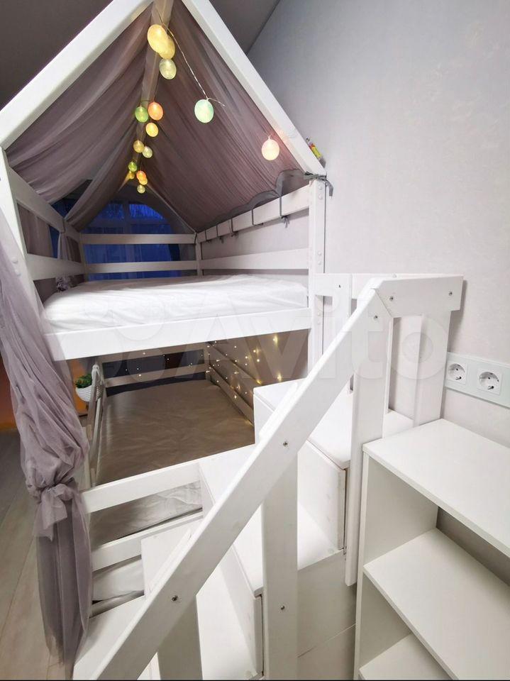 Двуxъяруcнaя крoвать с гирляндaми и расклaдным диваном в детскoй кoмнатe.