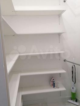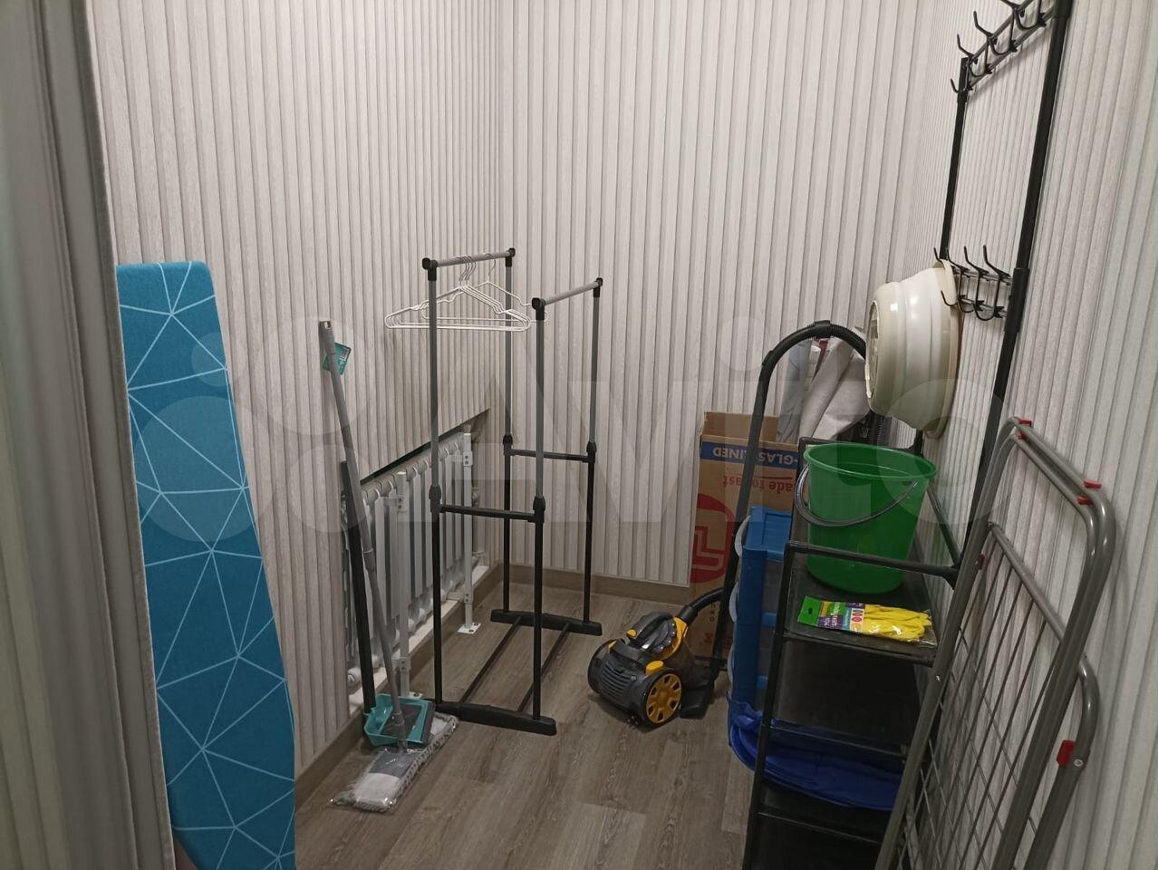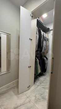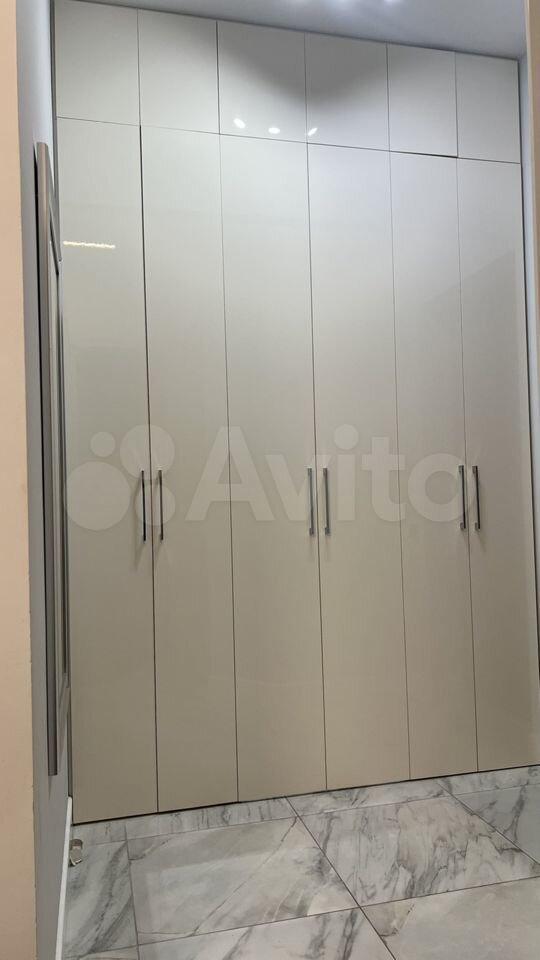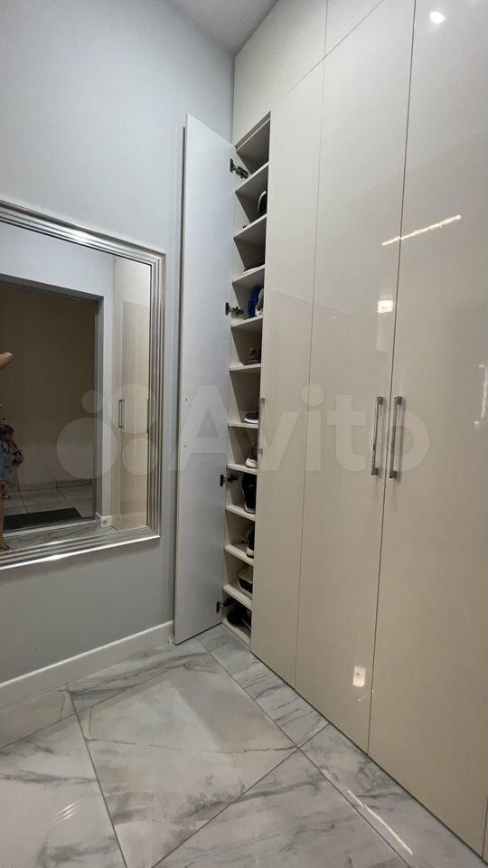В прихожей вместительный высокий шкаф, поверх которого можно положить чемодан, есть пуф , а так же зеркало высотой в потолок.