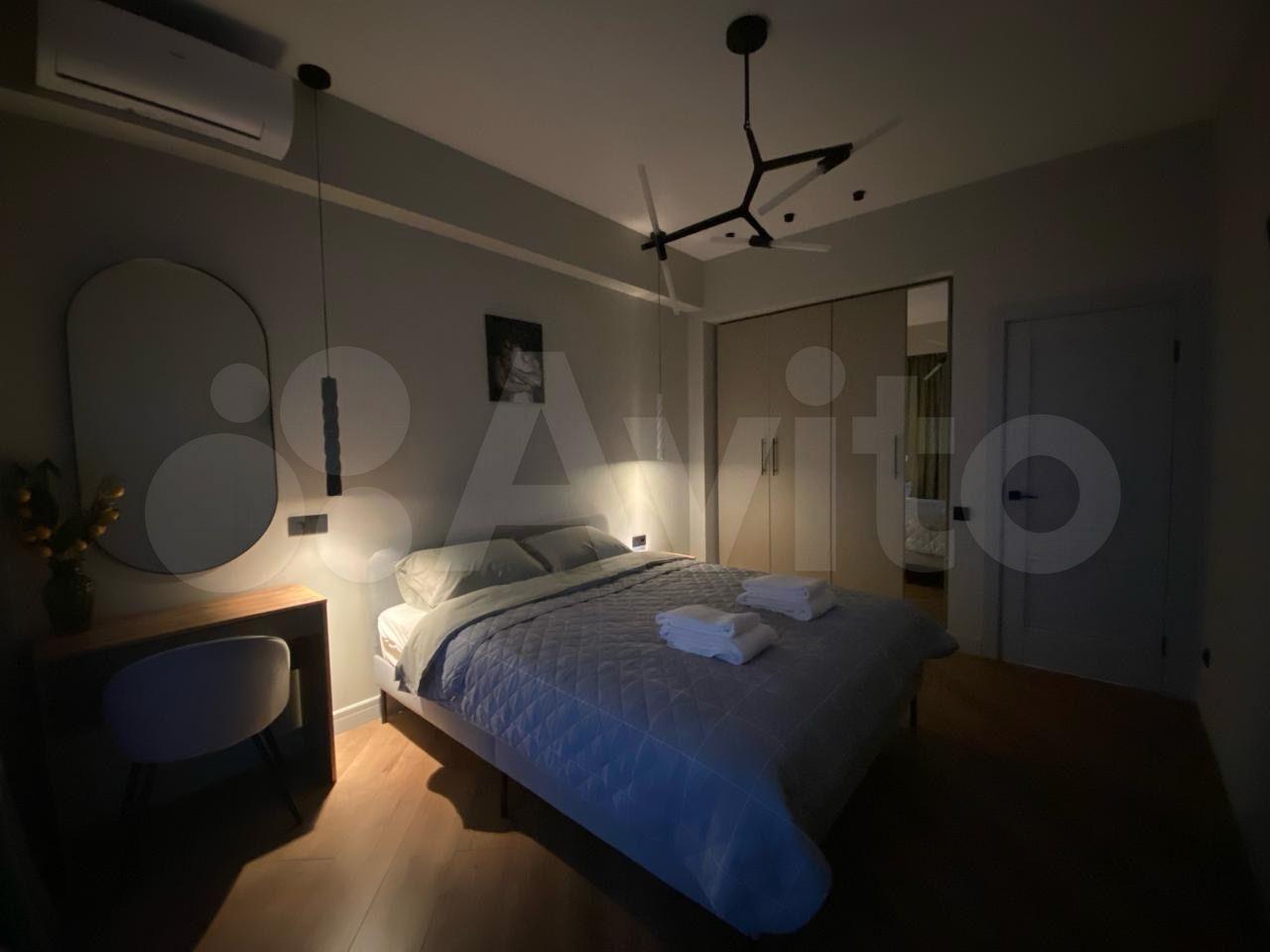В спальне: двуспальная кровать с хорошим матрасом, вместительный шкаф, гладильная доска, утюг, кондиционер, TV, туалетный столик, зеркало, три типа освещения.