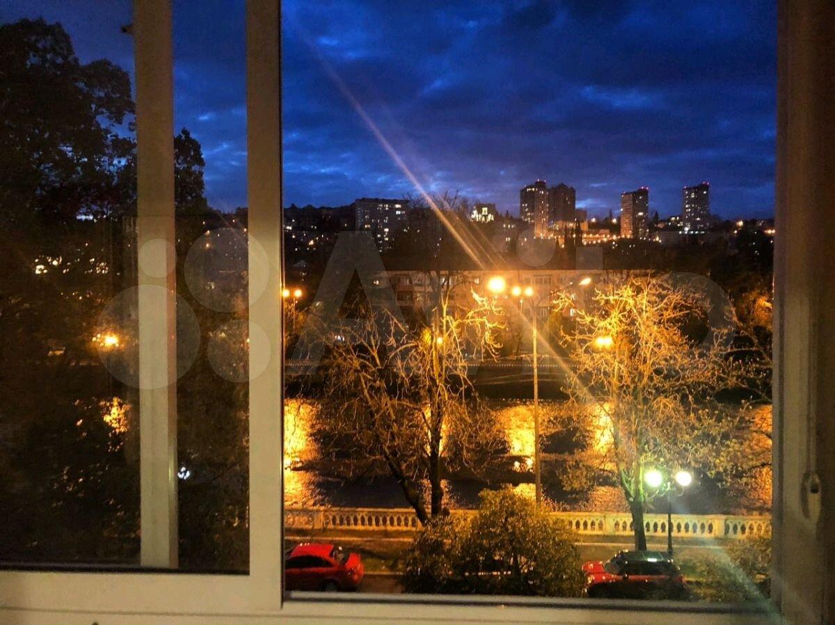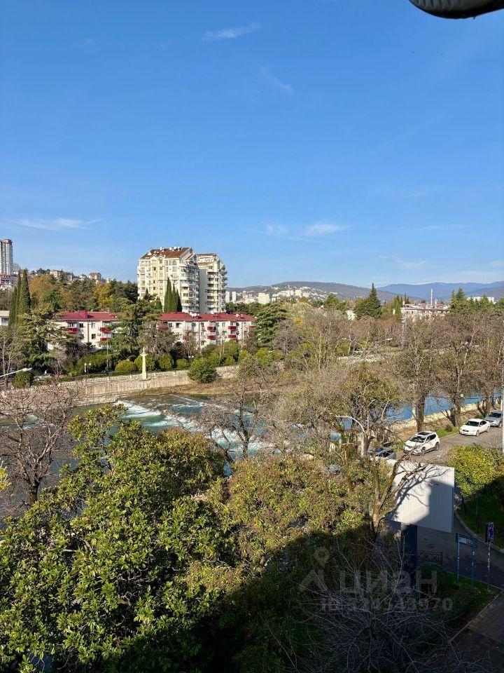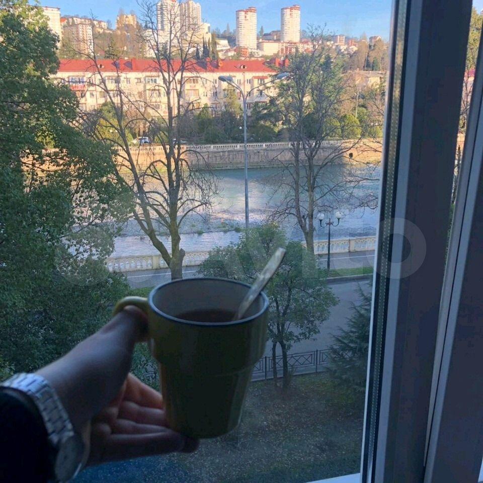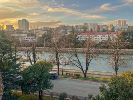 Из квартиры вид на 2 стороны: на реку и набережную р. Сочи и в тихий двор на Гимназию 1. Дом расположен в спокойном и уютном месте, до моря 20 минут прогулочным шагом по набережной реки, до Моремолла 15 минут пешком.