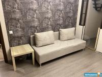 Две раздельные изолированные комнаты, три световые точки, раскладной угловой диван в одной комнате и односпальная кровать в другой.