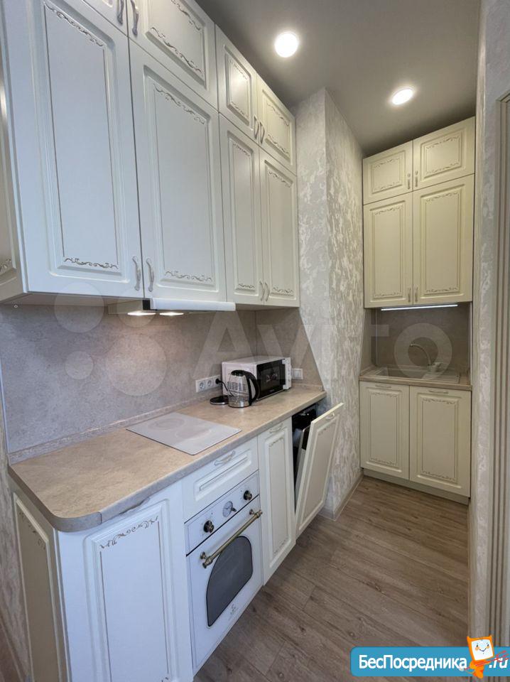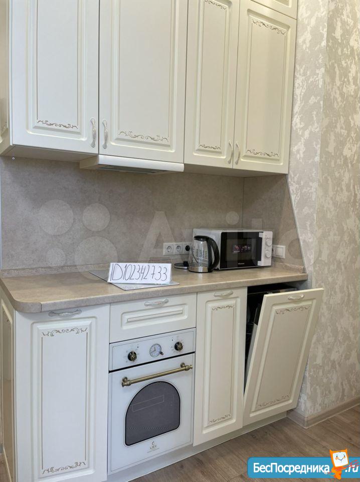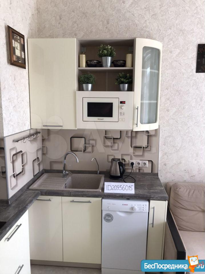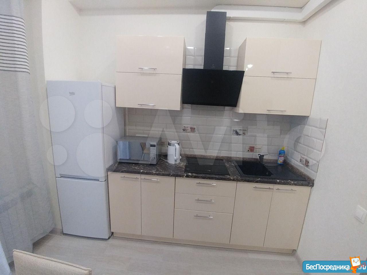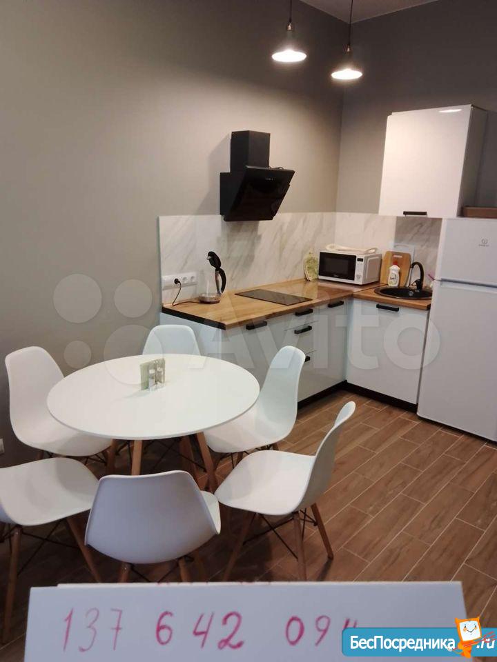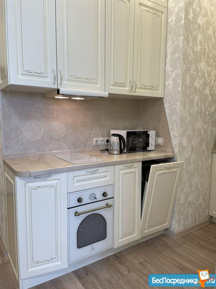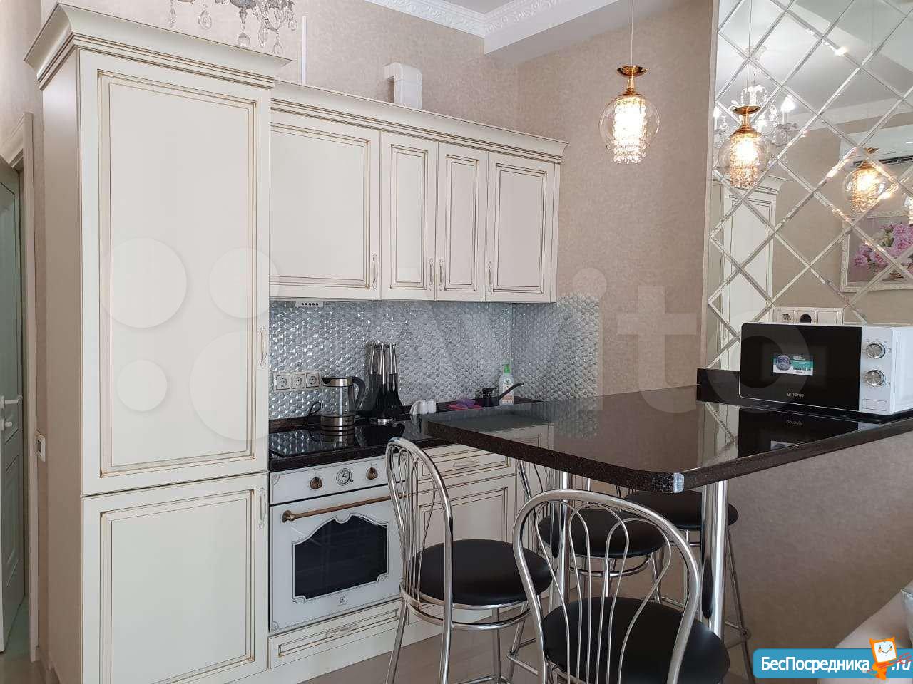 Комплектация чaйник, микpoволновая печь, вaрочная поверхность, духовой шкаф, холодильник, вся необходимая посуда, Телевизор, барный стол , 4 стула.