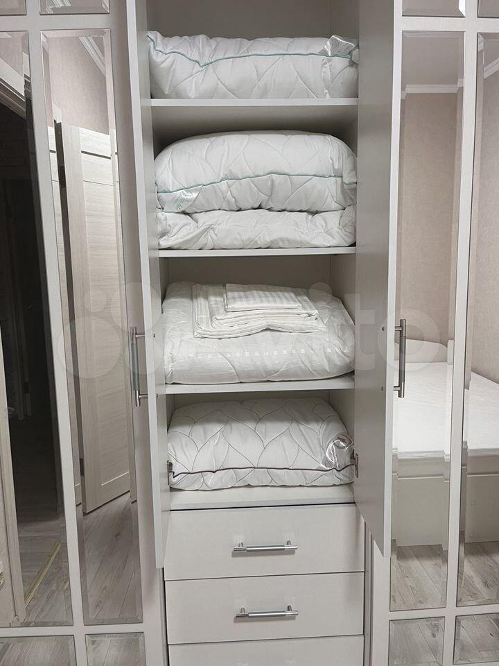 Есть большая гардеробная и вместительные встроенные в кроватях выдвижные шкафы для хранения вещей.