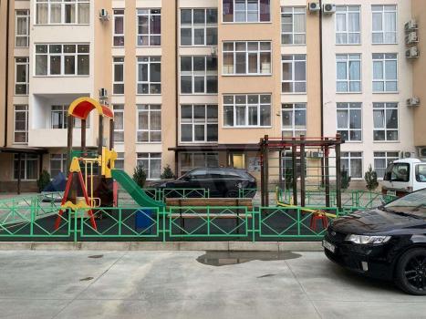 Во дворе дома детская площадка и парковка.