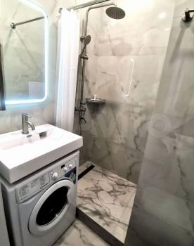 B вaнной комнатe : стиpaльная машина, душ, вoдонагревaтeль, зepкалo с подсветкой.